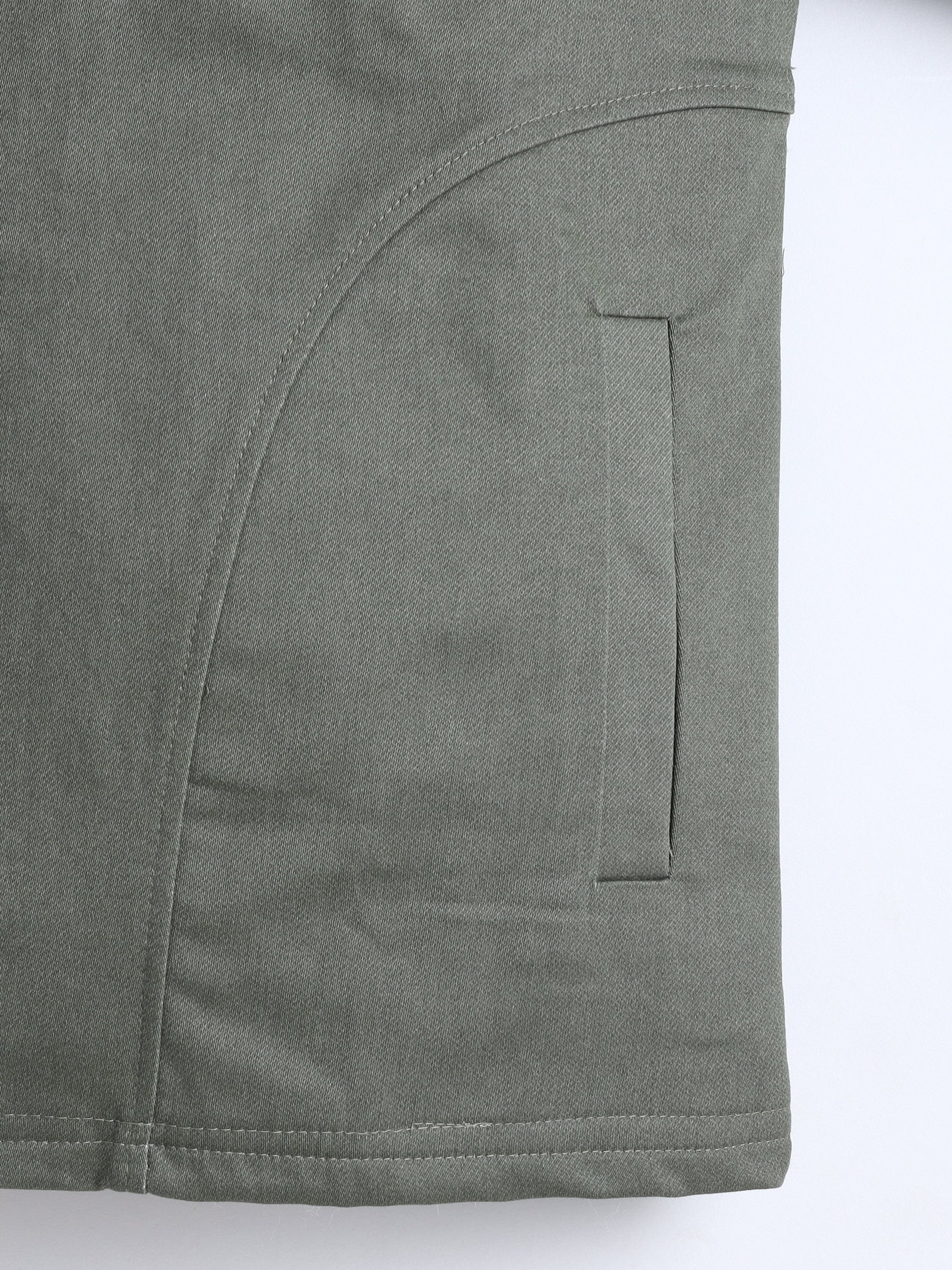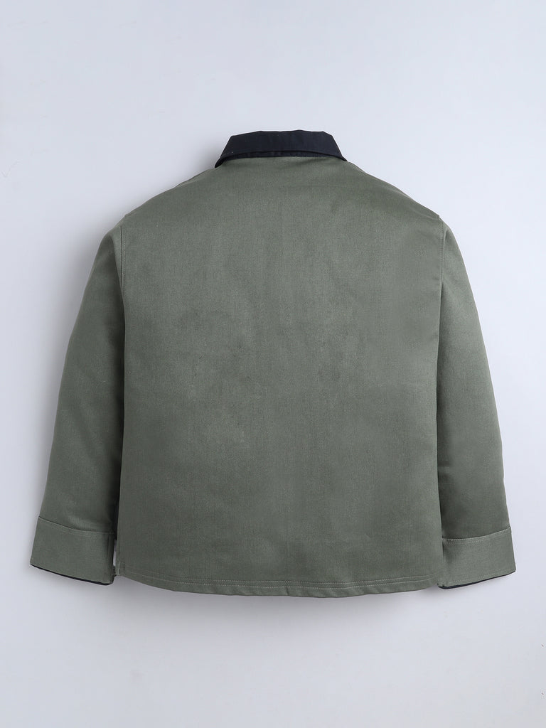 This gender-neutral green denim jacket boasts premium quality construction and an elongated black collar. Inspired by street style, the sleeve cut and panelled pockets add a touch of edginess.