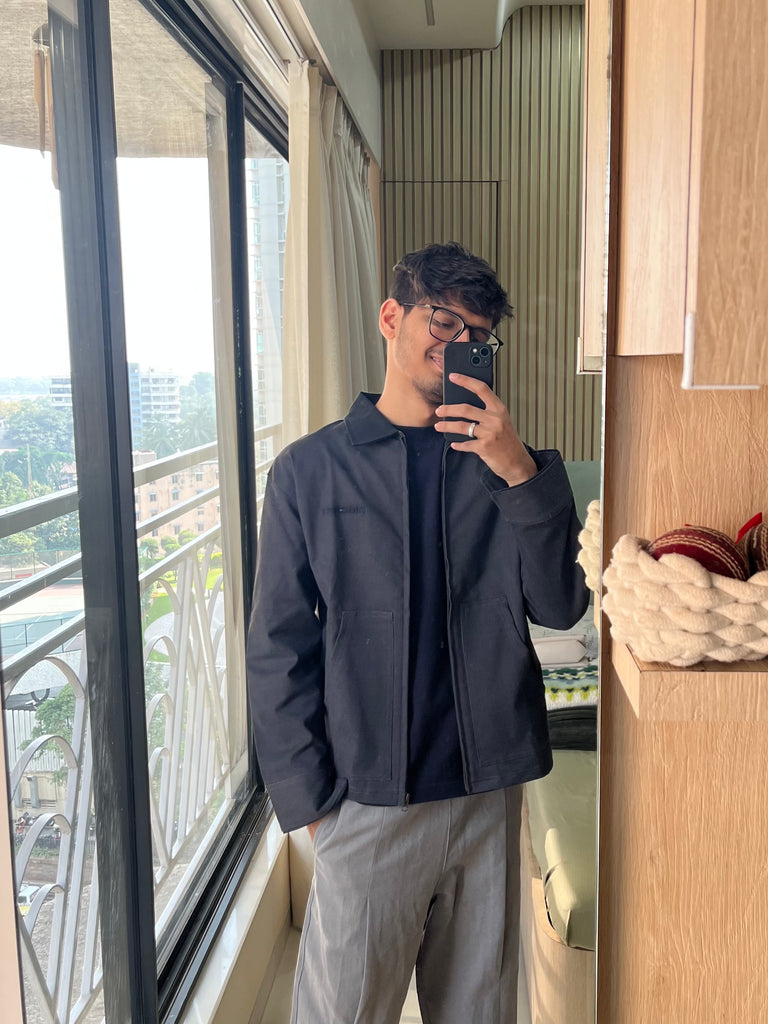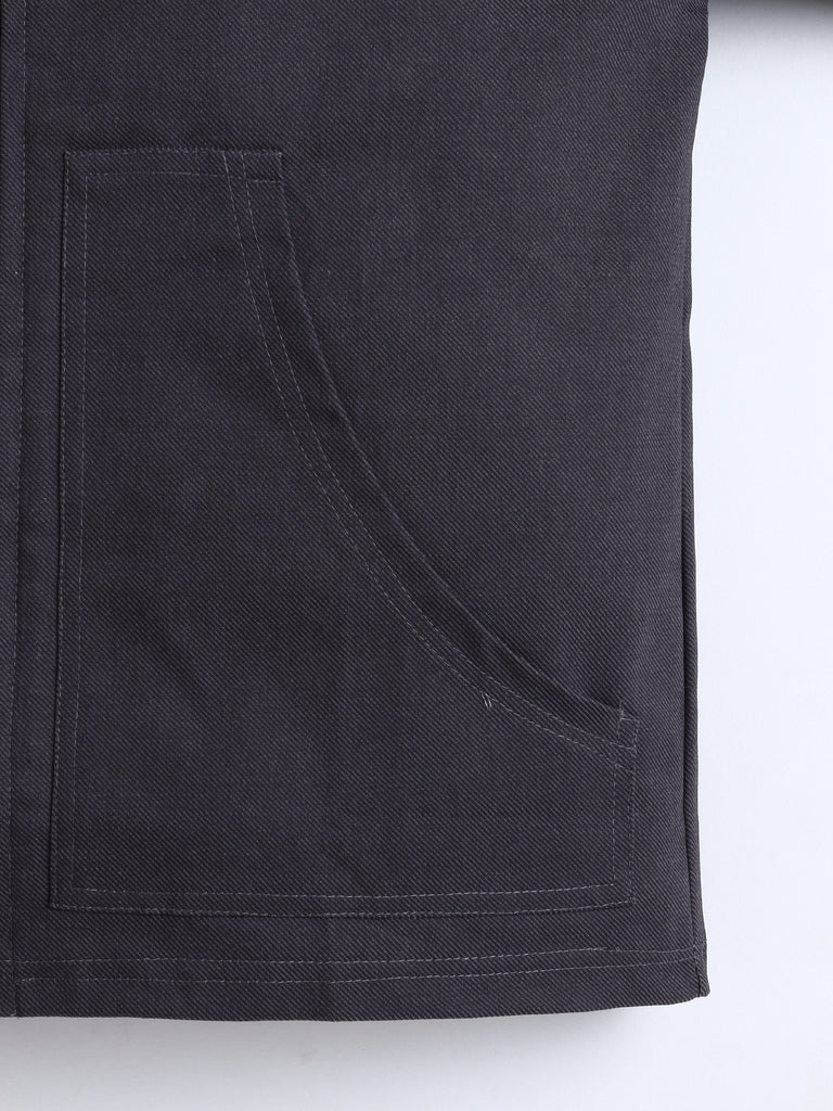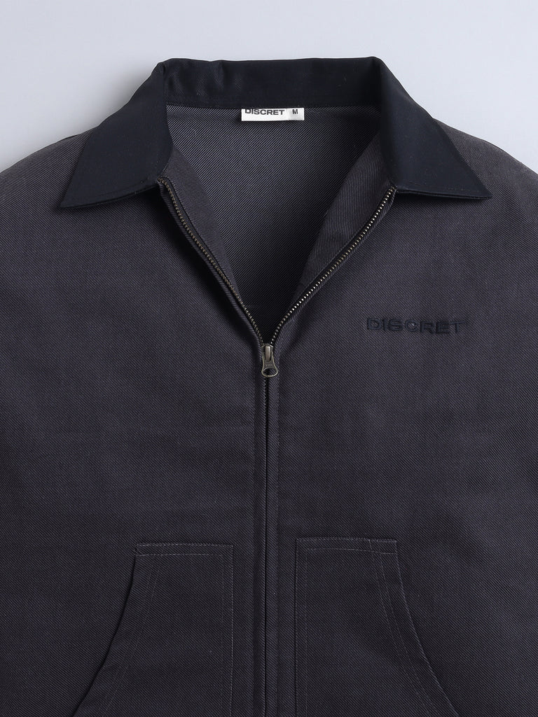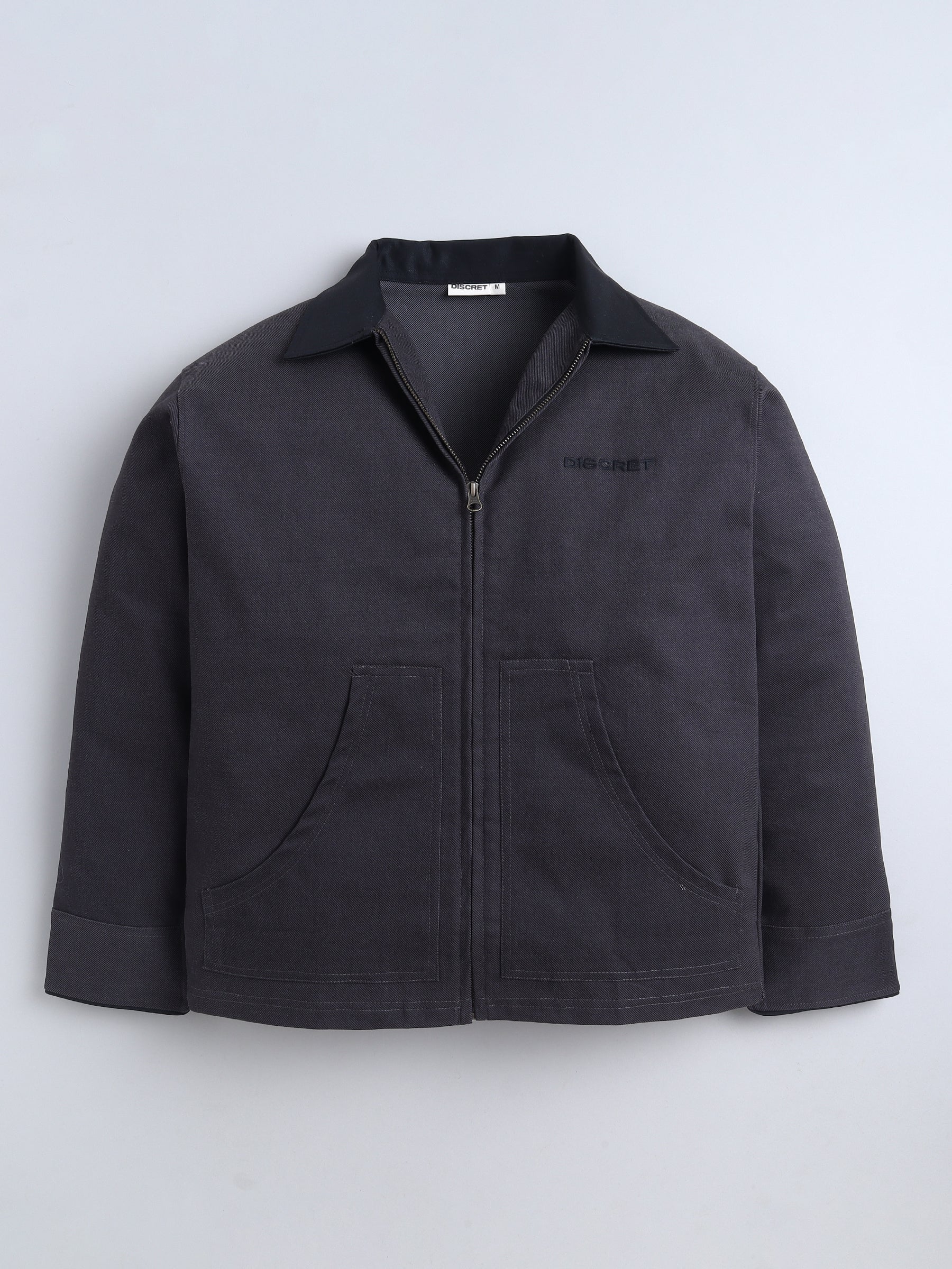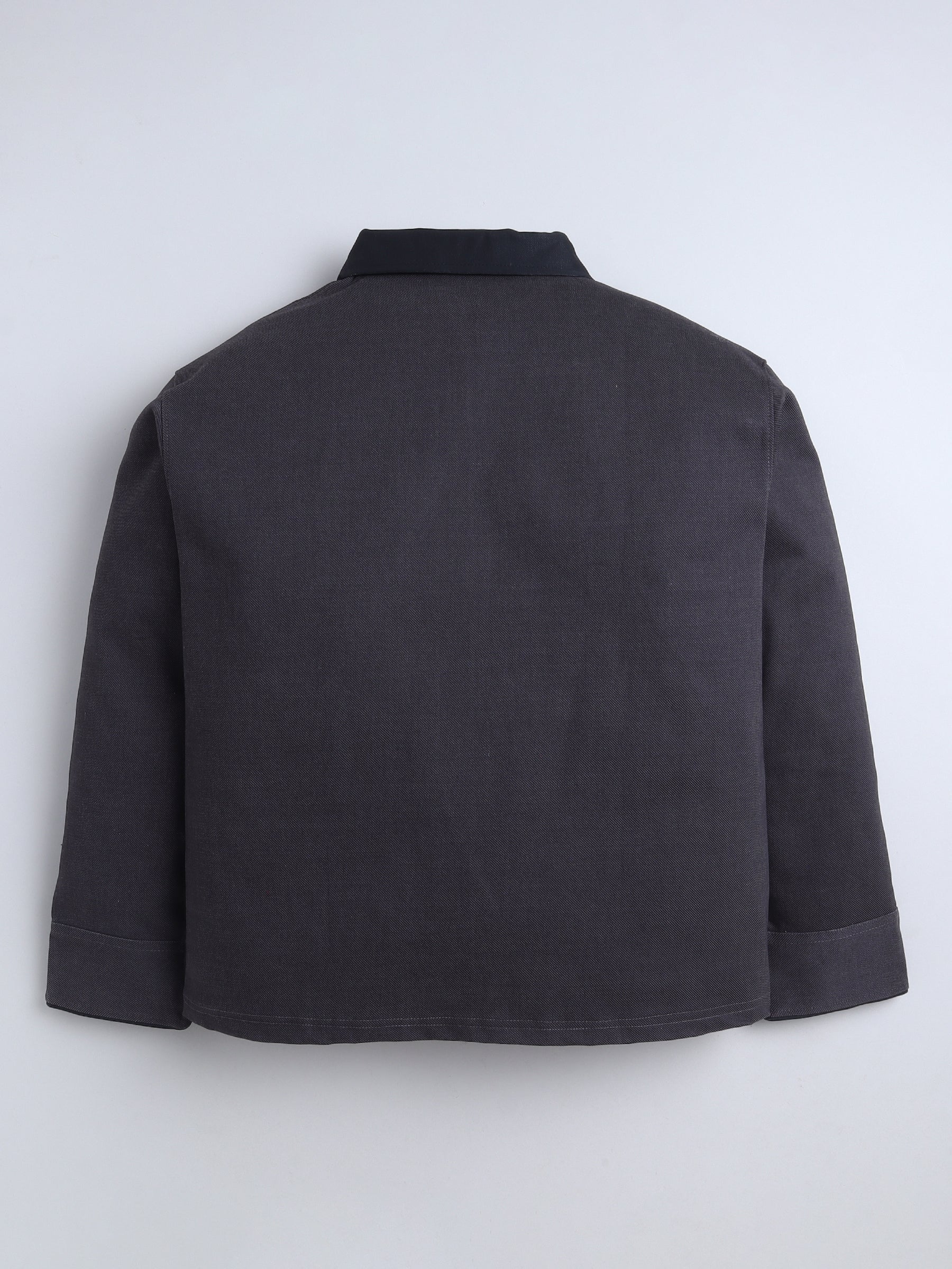 This gender-neutral wine denim jacket boasts premium quality construction and an elongated black collar. Inspired by street style, the sleeve cut and centered pockets add a touch of edginess.